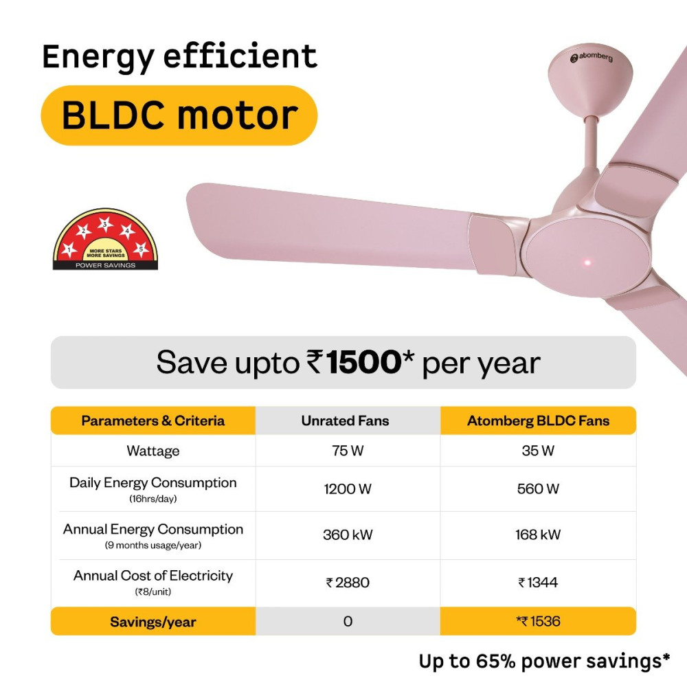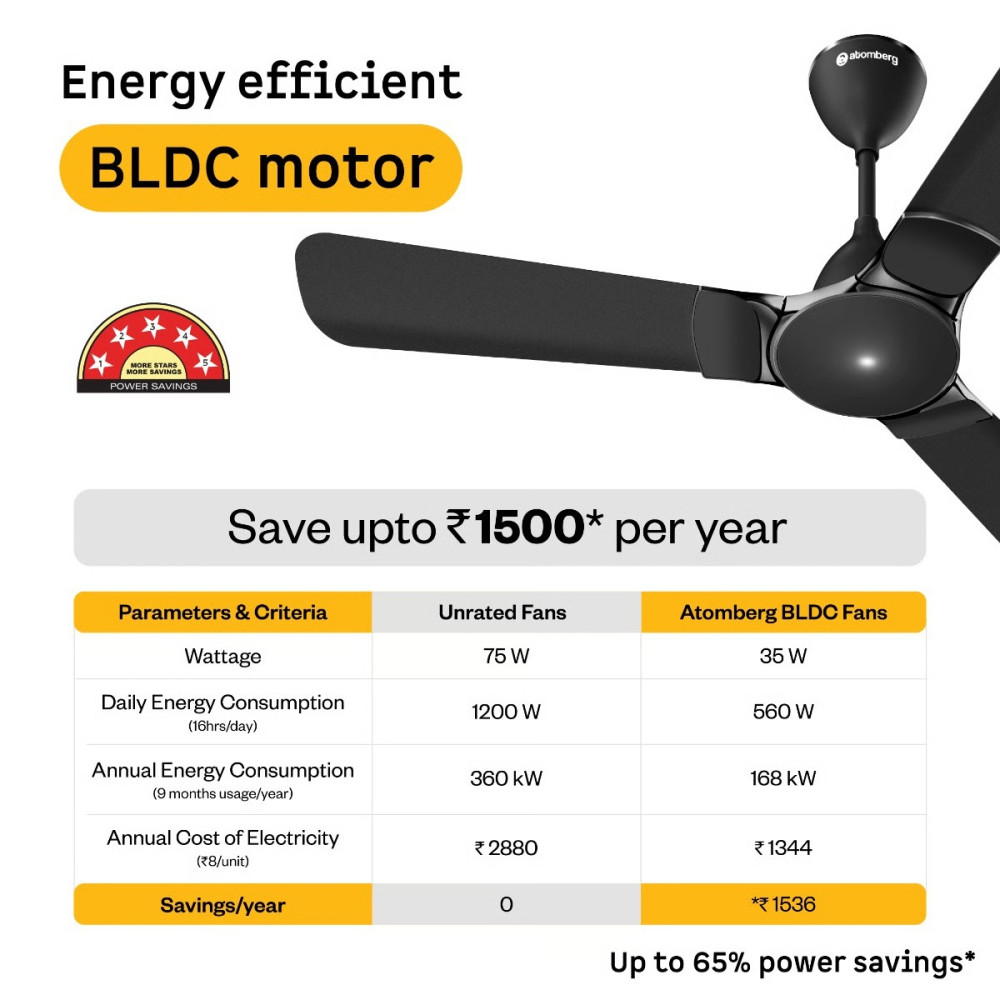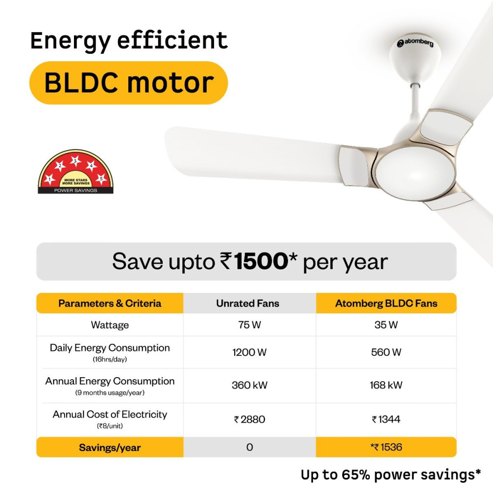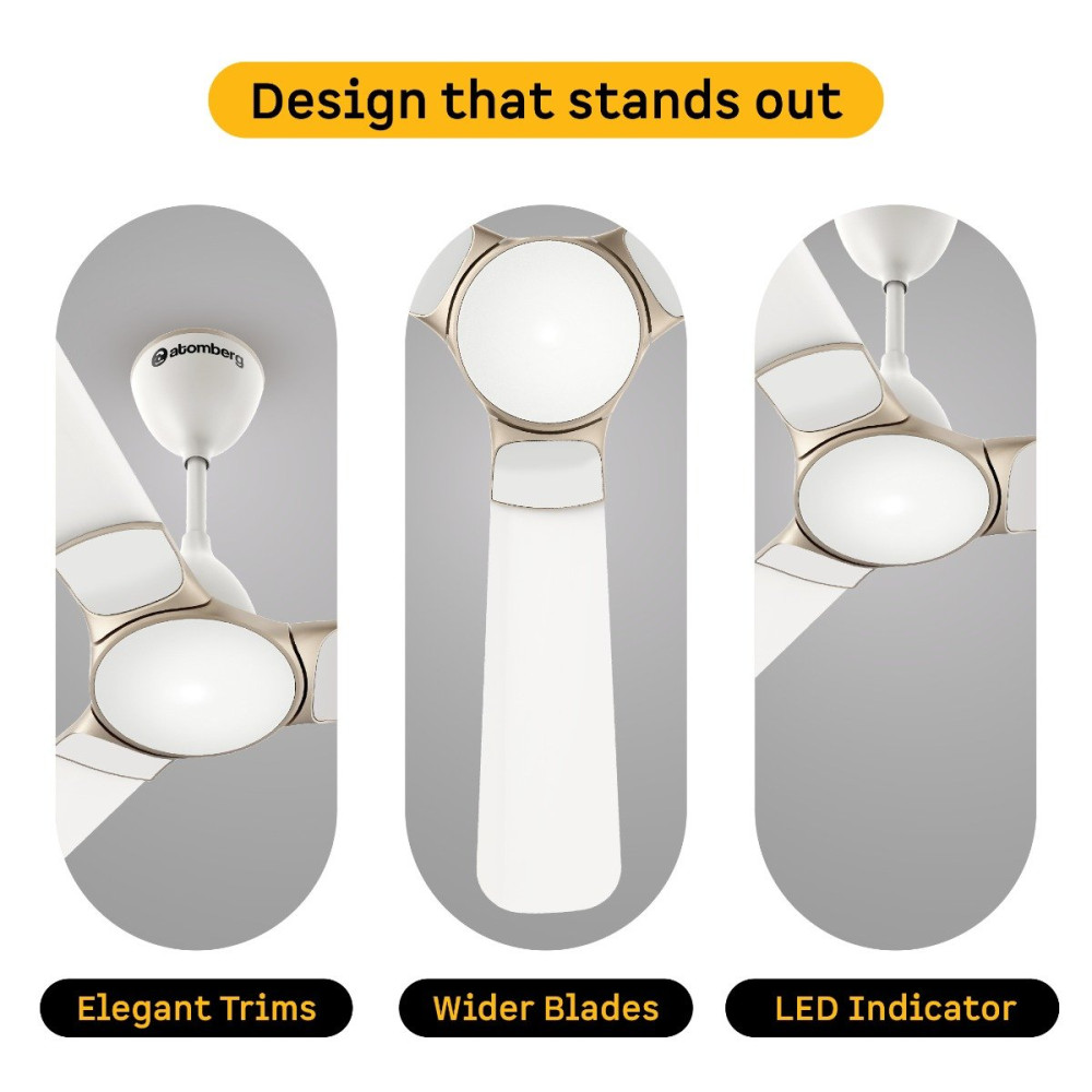 Atomberg Erica Nuvo is the winner of the prestigious Good Design Award (2022).�It has a premium modern design with wider blades, contrast blade trims, and an LED speed indicator. The fan has a high-quality lacquer paint that gives it a super-premium finish. Powered by a 5-star rated energy-efficient BLDC motor, it uses 35W at top speed, saving up to 65% electricity compared to unrated fans. It has noise levels of less than 57 dB. It offers high air delivery of 225 CMM, ensuring optimum airflow. Atomberg Erica Nuvo includes a Smart IR Remote enabling speed adjustment, Boost Mode, set timers, and Sleep Mode. It includes a ceiling plate beside a canopy set making it suitable for false or low ceiling height. It includes a 2-year warranty and an additional 1-year warranty when registered on the Atomberg website. It provides consistent speed even during voltage fluctuations (165V-285V) and runs 3X longer on inverter batteries ensuring uninterrupted airflow even during power outages. It is easy to install.