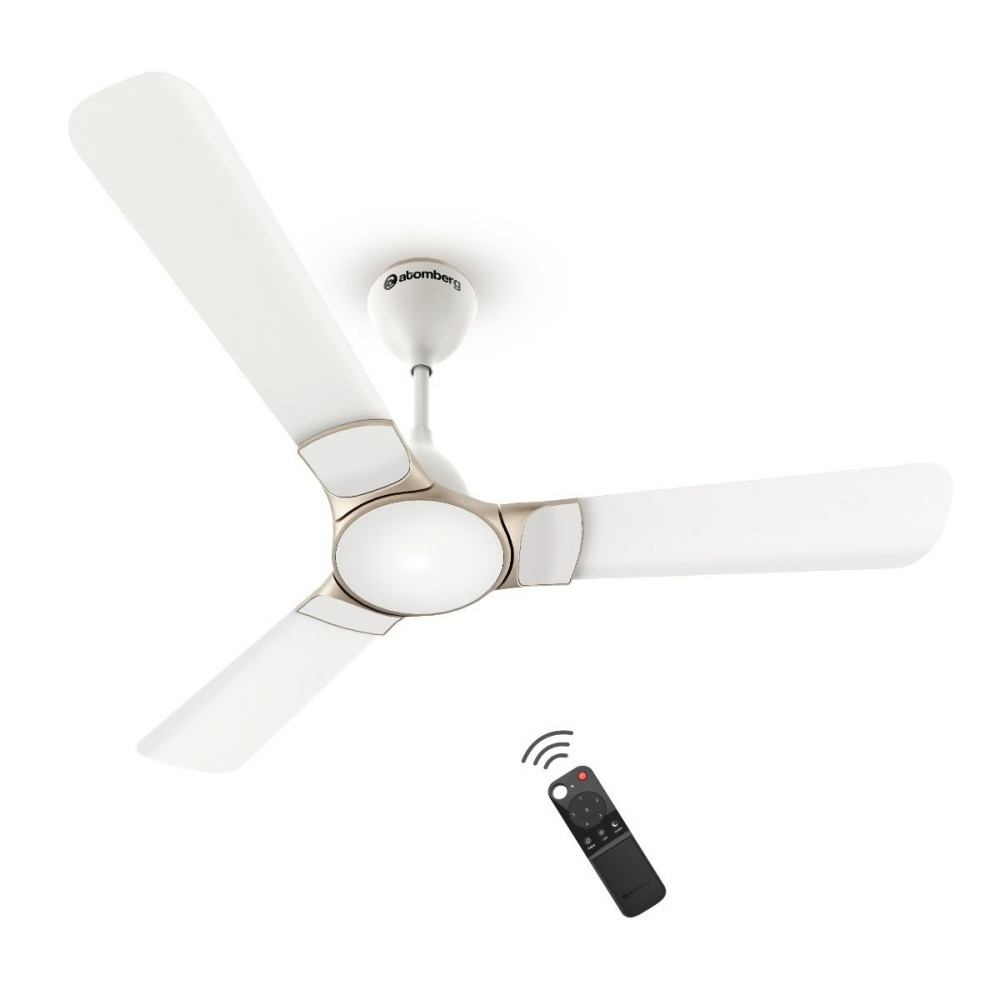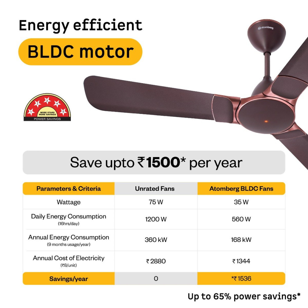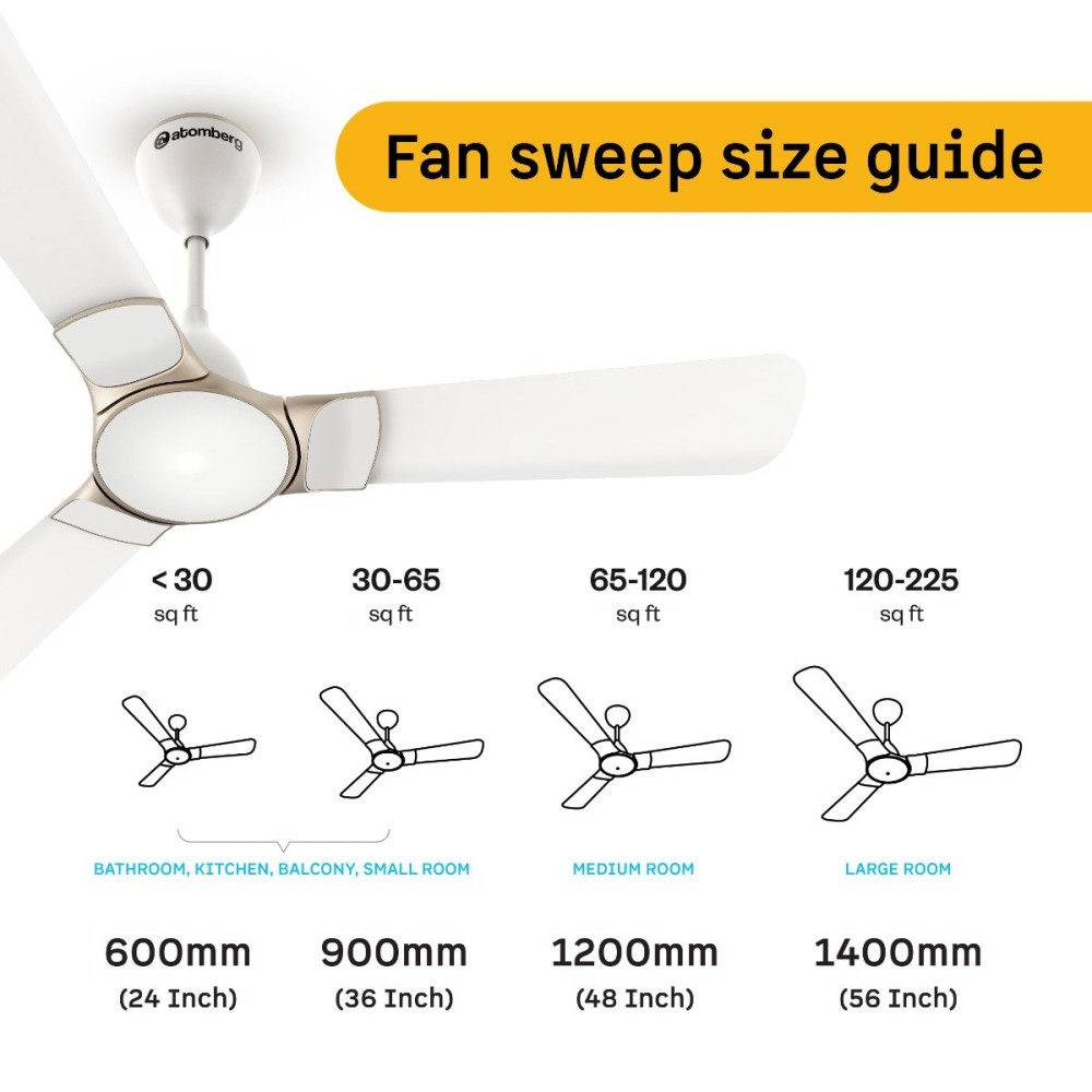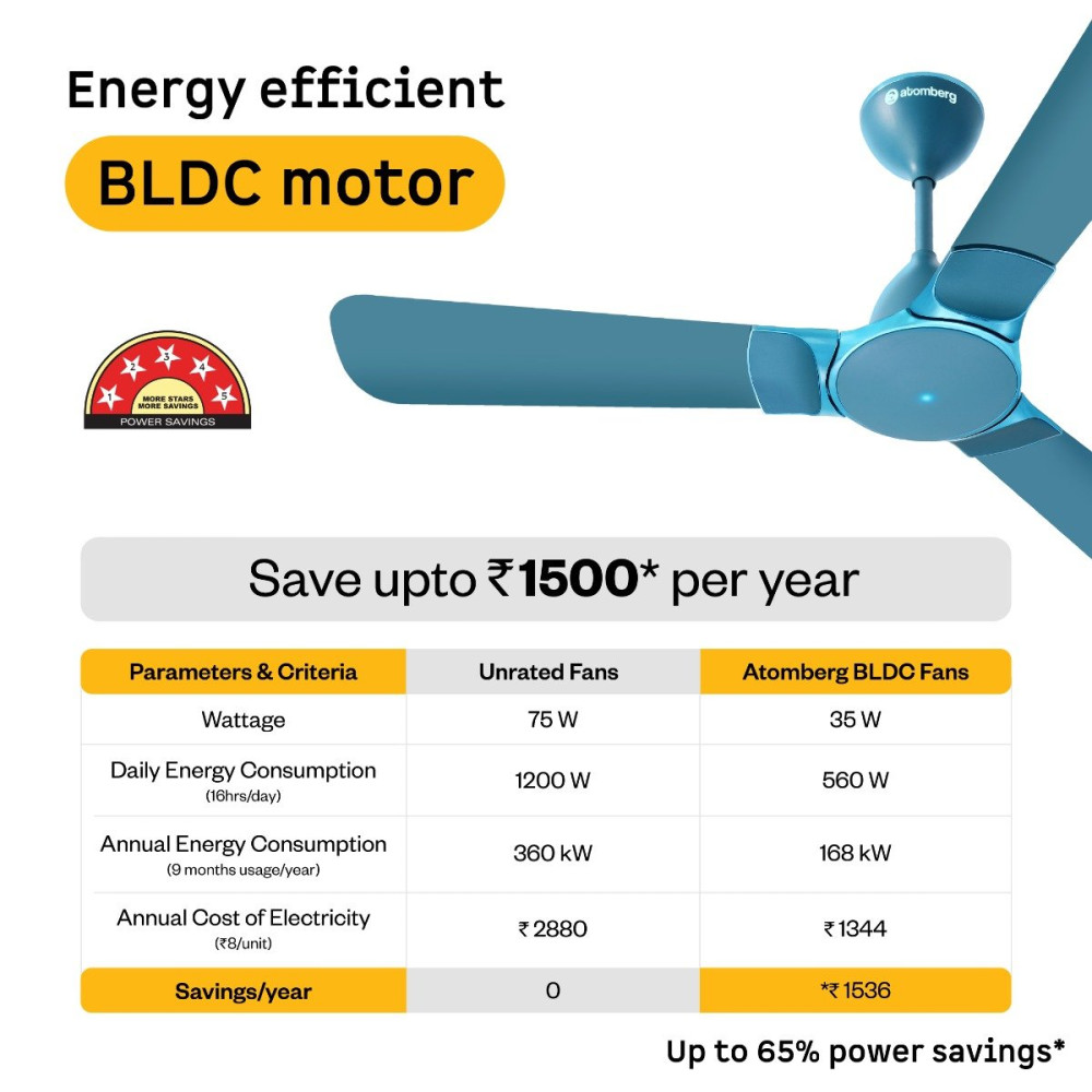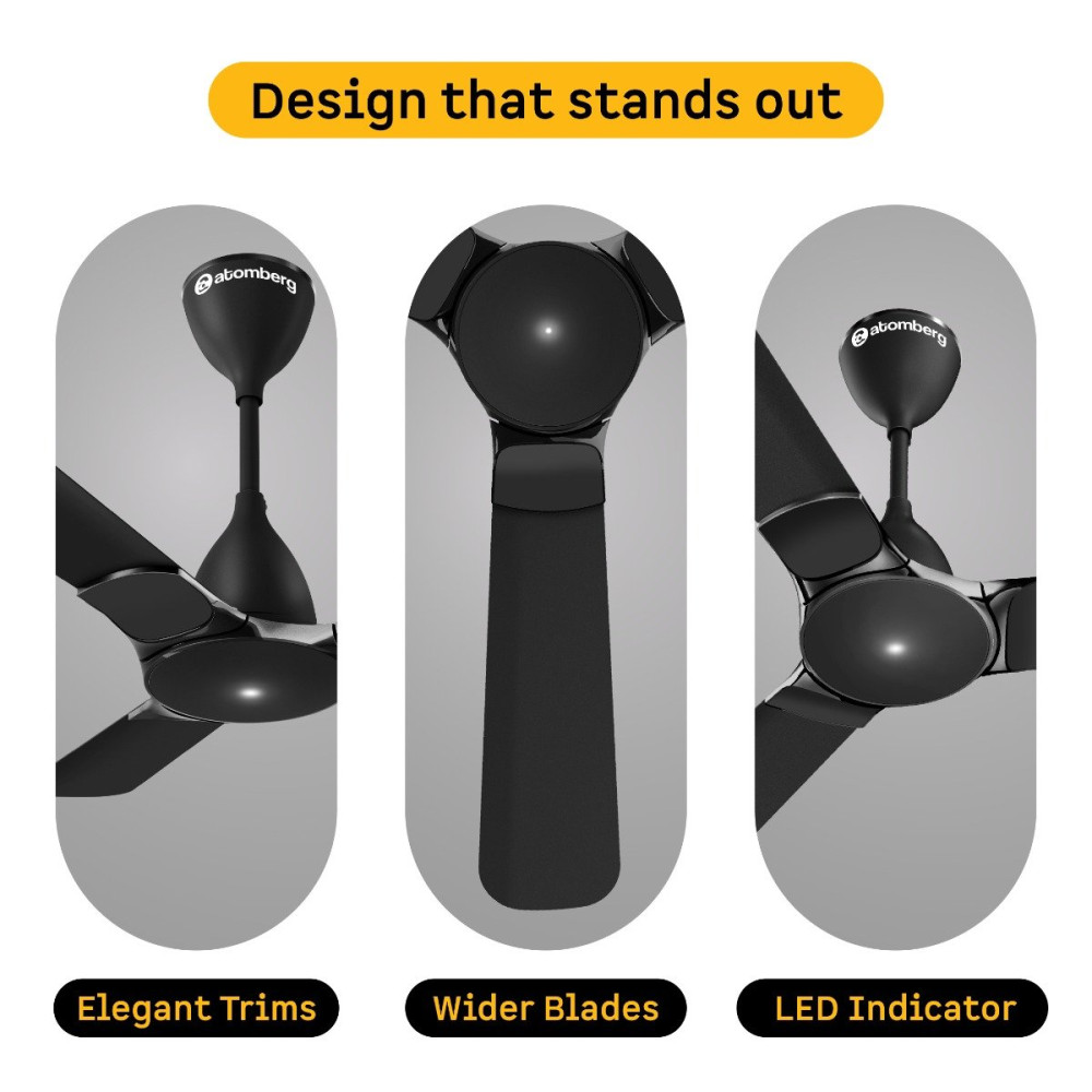 Atomberg Erica Nuvo is the winner of the prestigious Good Design Award (2022).�It has a premium modern design with wider blades, contrast blade trims, and an LED speed indicator. The fan has a high-quality lacquer paint that gives it a super-premium finish. Powered by a 5-star rated energy-efficient BLDC motor, it uses 35W at top speed, saving up to 65% electricity compared to unrated fans. It has noise levels of less than 57 dB. It offers high air delivery of 225 CMM, ensuring optimum airflow. Atomberg Erica Nuvo includes a Smart IR Remote enabling speed adjustment, Boost Mode, set timers, and Sleep Mode. It includes a ceiling plate beside a canopy set making it suitable for false or low ceiling height. It includes a 2-year warranty and an additional 1-year warranty when registered on the Atomberg website. It provides consistent speed even during voltage fluctuations (165V-285V) and runs 3X longer on inverter batteries ensuring uninterrupted airflow even during power outages. It is easy to install.