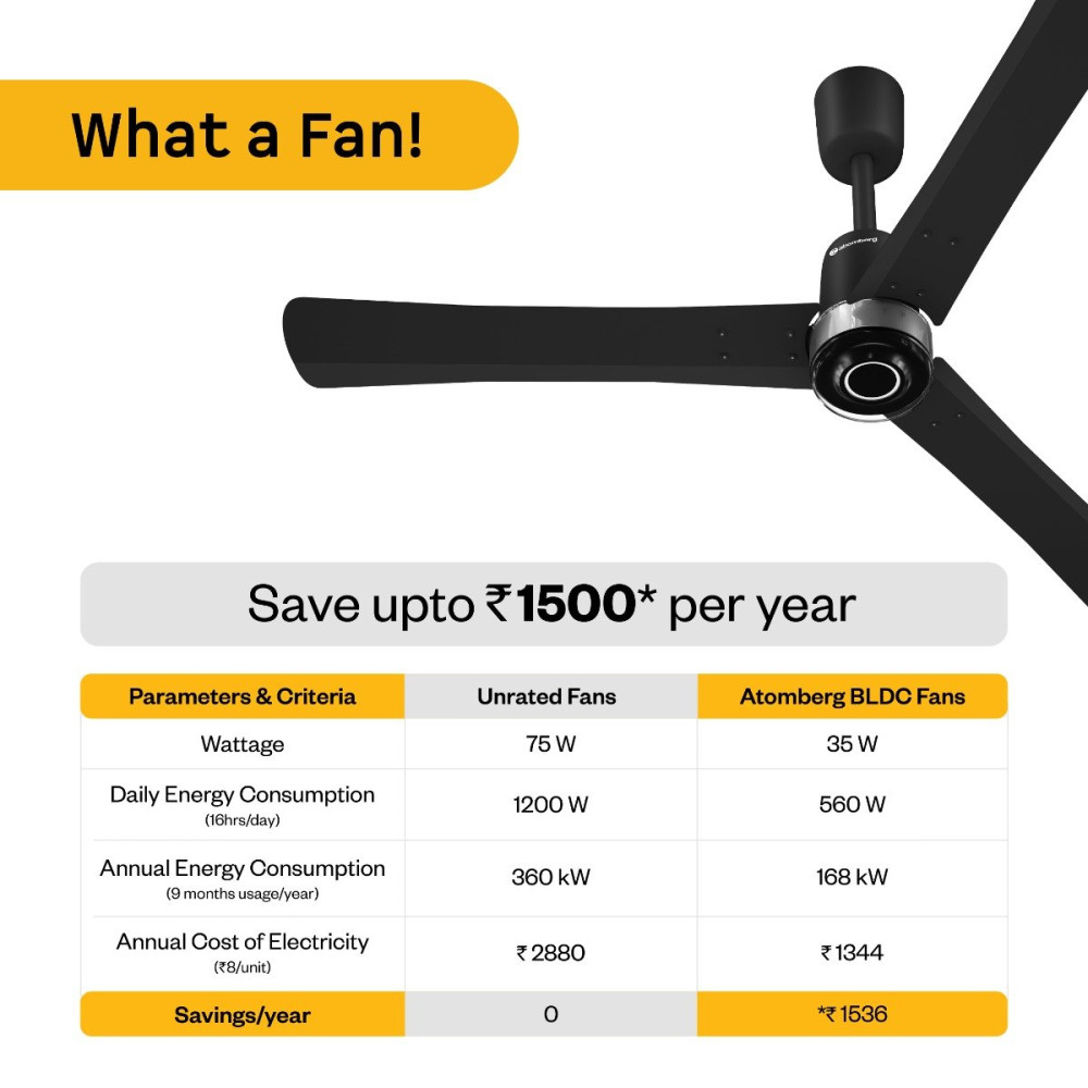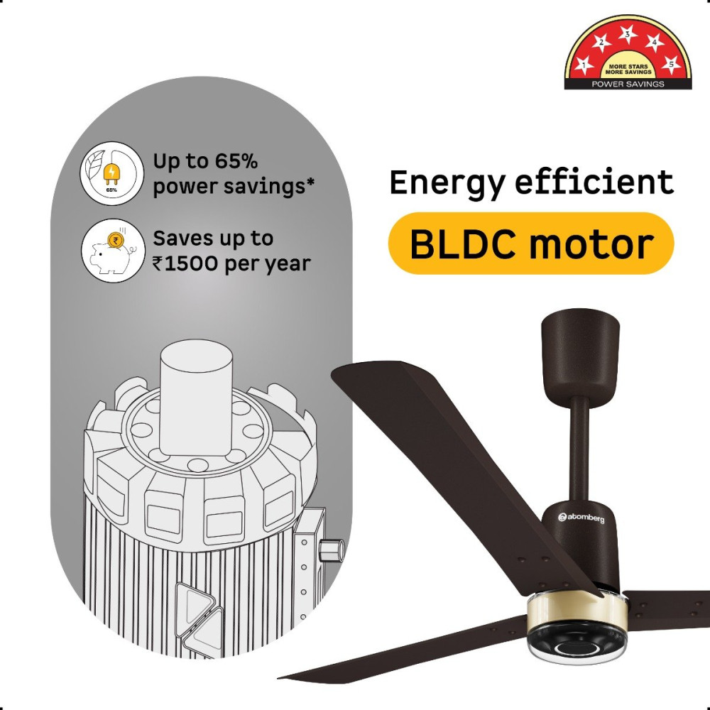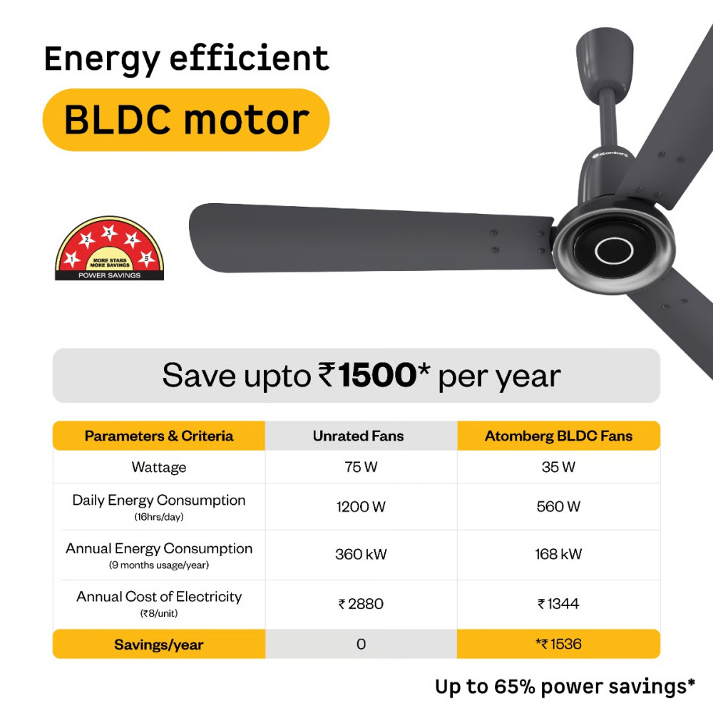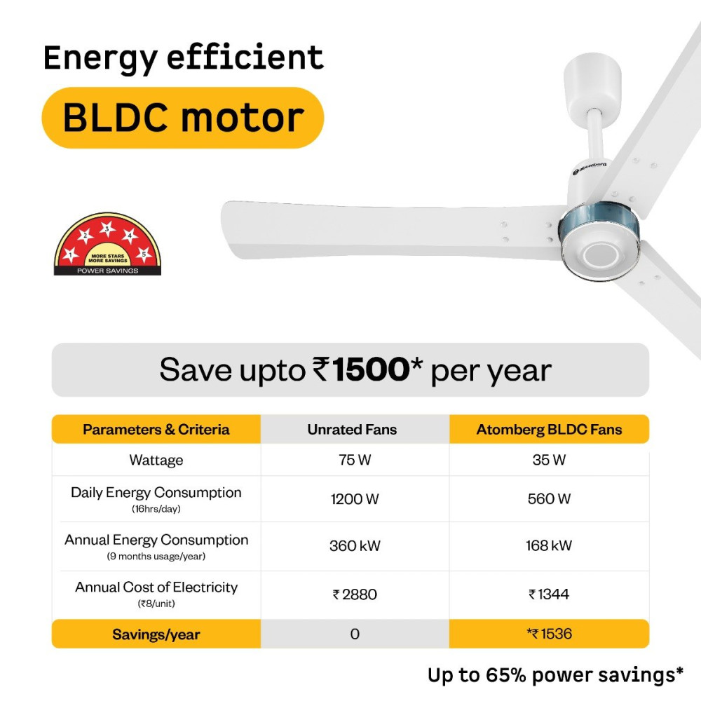 Atomberg Renesa Elite Fan comes with a 5-star rated, energy-efficient BLDC motor that consumes just 35W and gives air delivery of 230 CMM. It is easy to clean and corrosion-resistant. It has a sleek design with a unique transparent diffuser and a contrasting ring. It has a moonbeam LED light that functions as a night light. It comes with 2 intensity levels that can be controlled using the remote. Additionally, the moonbeam blinks in response to remote commands like turning the fan on/off, adjusting speed or setting the timer and sleep mode, providing clear, real-time feedback for every action. The fan runs silently at <57 dB, much quieter than regular fans. It includes Smart IR Remote enabling speed adjustment, set timers, and sleep mode, allowing easy operation. It provides consistent speed even during voltage fluctuations (165V-285V). It is easy to install on full ceiling as well as low or false ceiling.