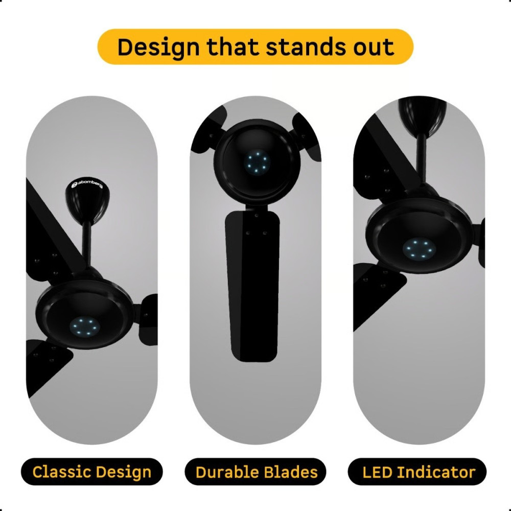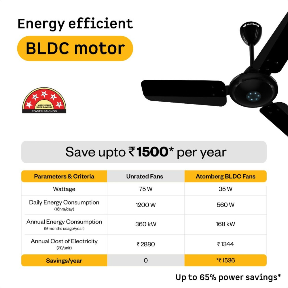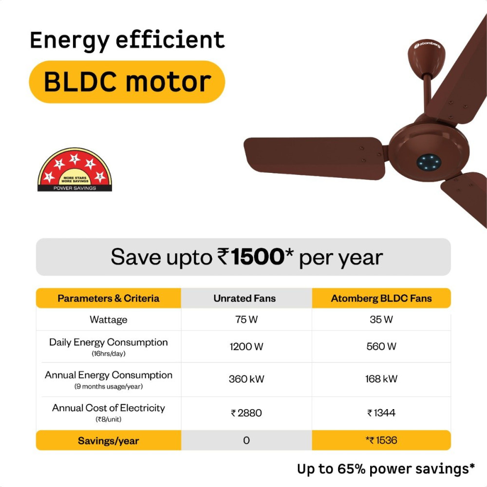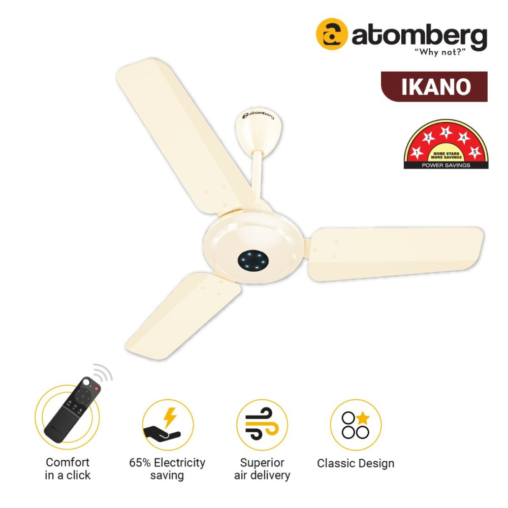 The Atomberg Ikano 1200mm ceiling fan features energy-efficient BLDC technology, providing superior air delivery of 235 CMM at 380 RPM while consuming only 28W (at speed 5). With a 5-star rating, the Ikano remote ceiling fan saves up to 65% in electricity consumption. The Ikano 1200mm ceiling fan includes a convenient IR remote for easy control of fan speed and has unique features like boost mode, timer, and sleep mode. With its classic-fan design and LED light, the Ikano ceiling fan enhances your home decor. The Ikano remote 1200mm ceiling fan provides consistent speed during voltage fluctuations and comes with a 2+1 year warranty. It is a perfect remote fan for your ceiling.