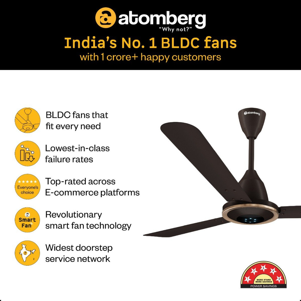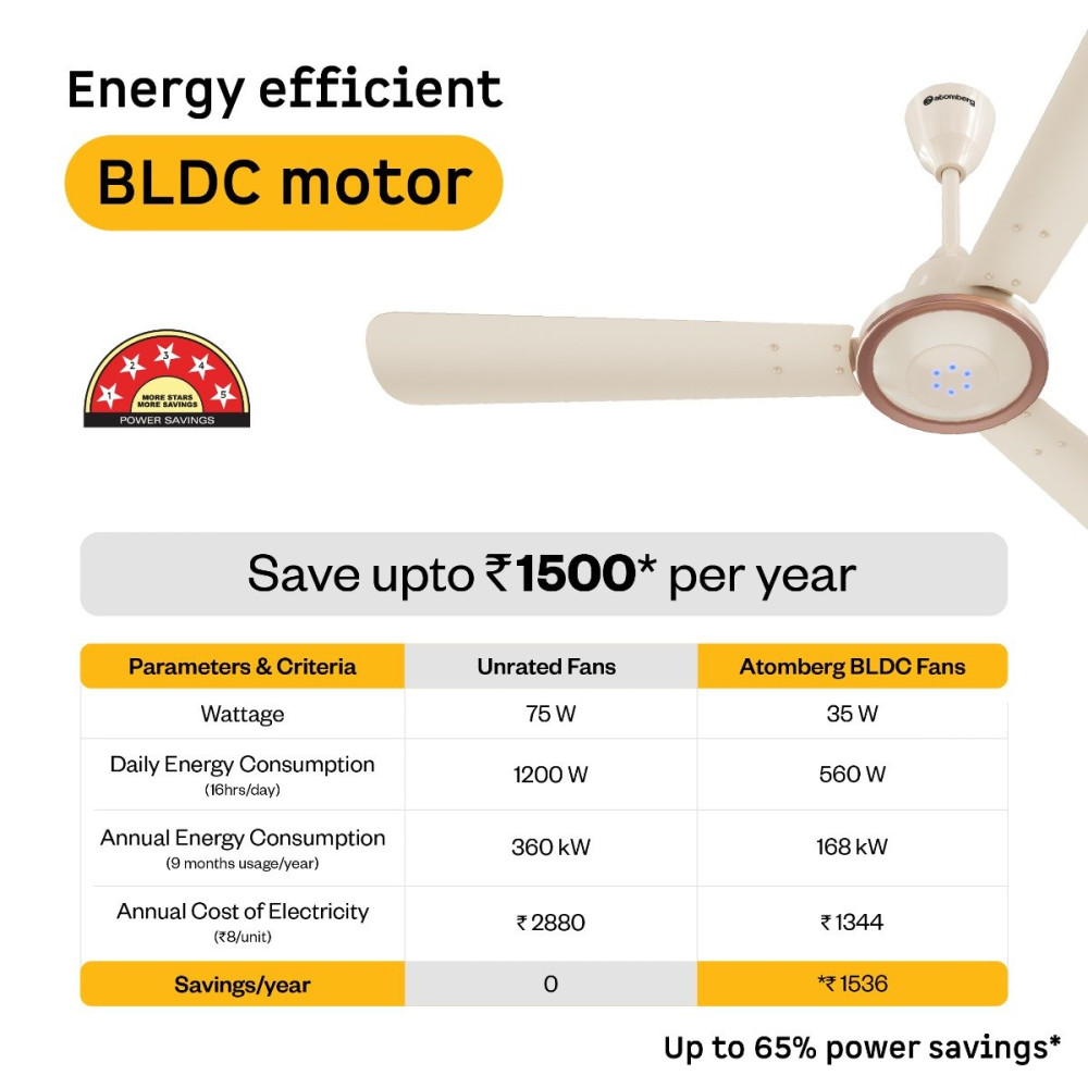 - ENERGY-EFFICIENT BLDC TECHNOLOGY: Atomberg Erica Artesta comes with a 5-star rated energy-efficient BLDC motor. This BEE 5-star rated fan consumes only 35W at top speed, saving up to 65% in electricity consumption compared to unrated fans.