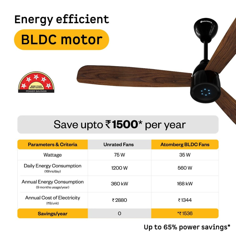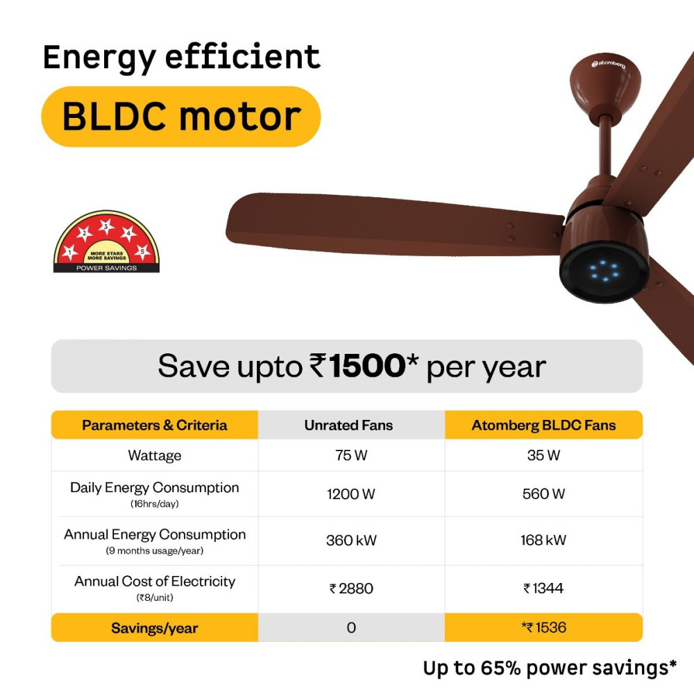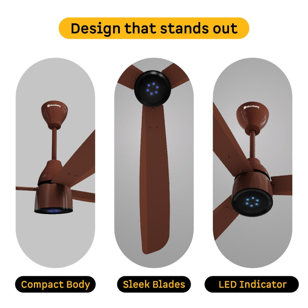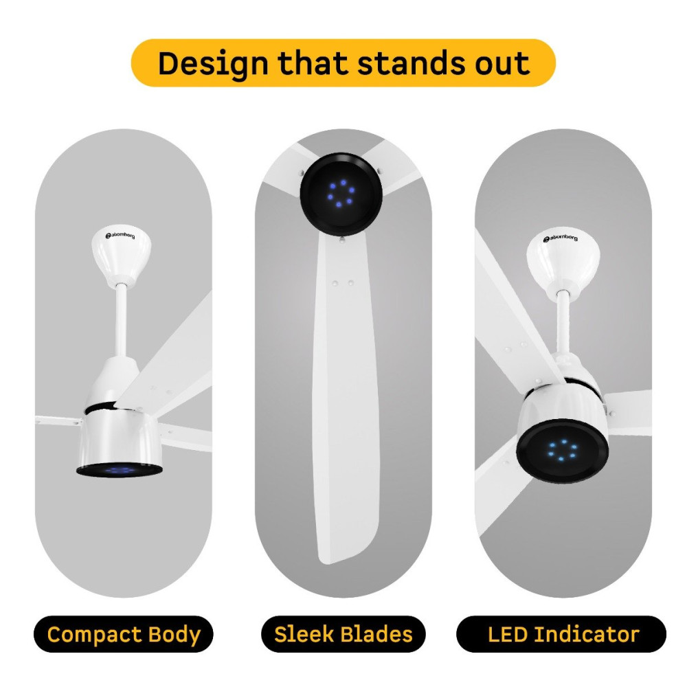 Atomberg Renesa Prime Remote Fan comes with a 5-star rated, energy-efficient BLDC motor that consumes just 35W and gives air delivery of 180 CMM. It is easy to clean and corrosion-resistant. It has a compact body with sleek designer blades and an LED speed indicator, elevating your rooms decor. It features an LED light that glows to indicate functions like turning the fan on/off, adjusting the speed, or setting the timer or sleep mode, providing clear feedback for each operation via the remote. The fan runs silently at <57 dB, much quieter than regular fans. It includes a Smart IR Remote enabling speed adjustment, set timers, and Sleep Mode, allowing easy operation. It provides consistent speed even during voltage fluctuations (165V-285V). It is easy to install on full ceiling height using both the top and bottom canopies, as well as low ceiling height using the top canopy and the canopy plate.