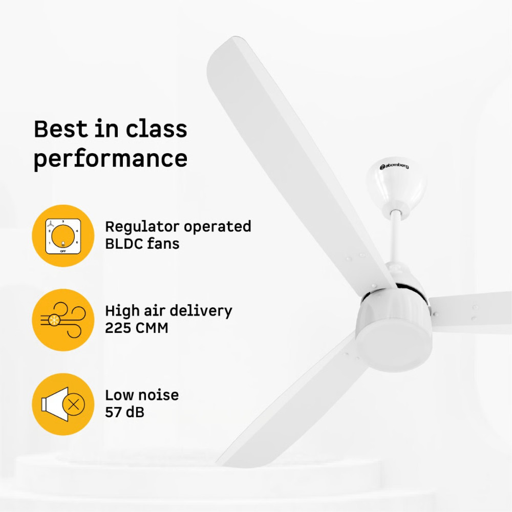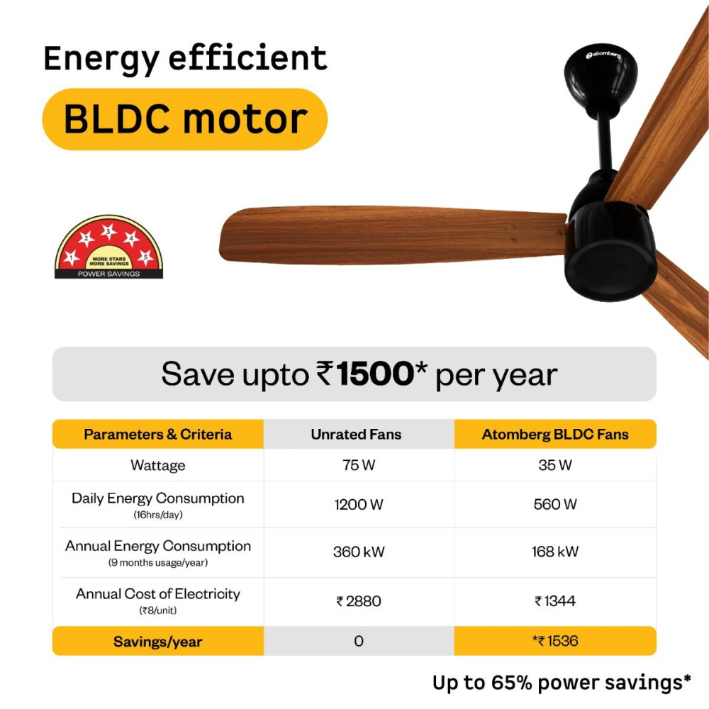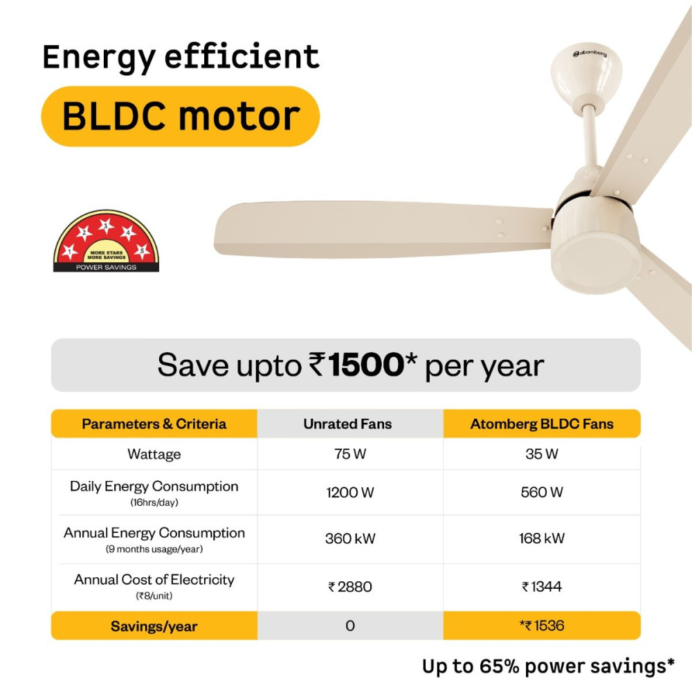 The Atomberg Renesa Prime Regulator ceiling fan features energy-efficient 5-Star rated BLDC motor technology, providing superior air delivery of 225 CMM with 350 RPM while consuming only 28W (at speed 5), resulting in up to 65% savings in power consumption. This ceiling fan is designed to be operated with any Step Regulator and does not support remote operation. Its sleek and unique design adds a stylish touch to your home decor. The Renesa Prime Regulator ceiling fan ensures consistent speed even during voltage fluctuations ranging from 220V to 240V, making it reliable for extended use on inverter batteries during power outages. The ceiling fan comes with a 2+1 year warranty.
