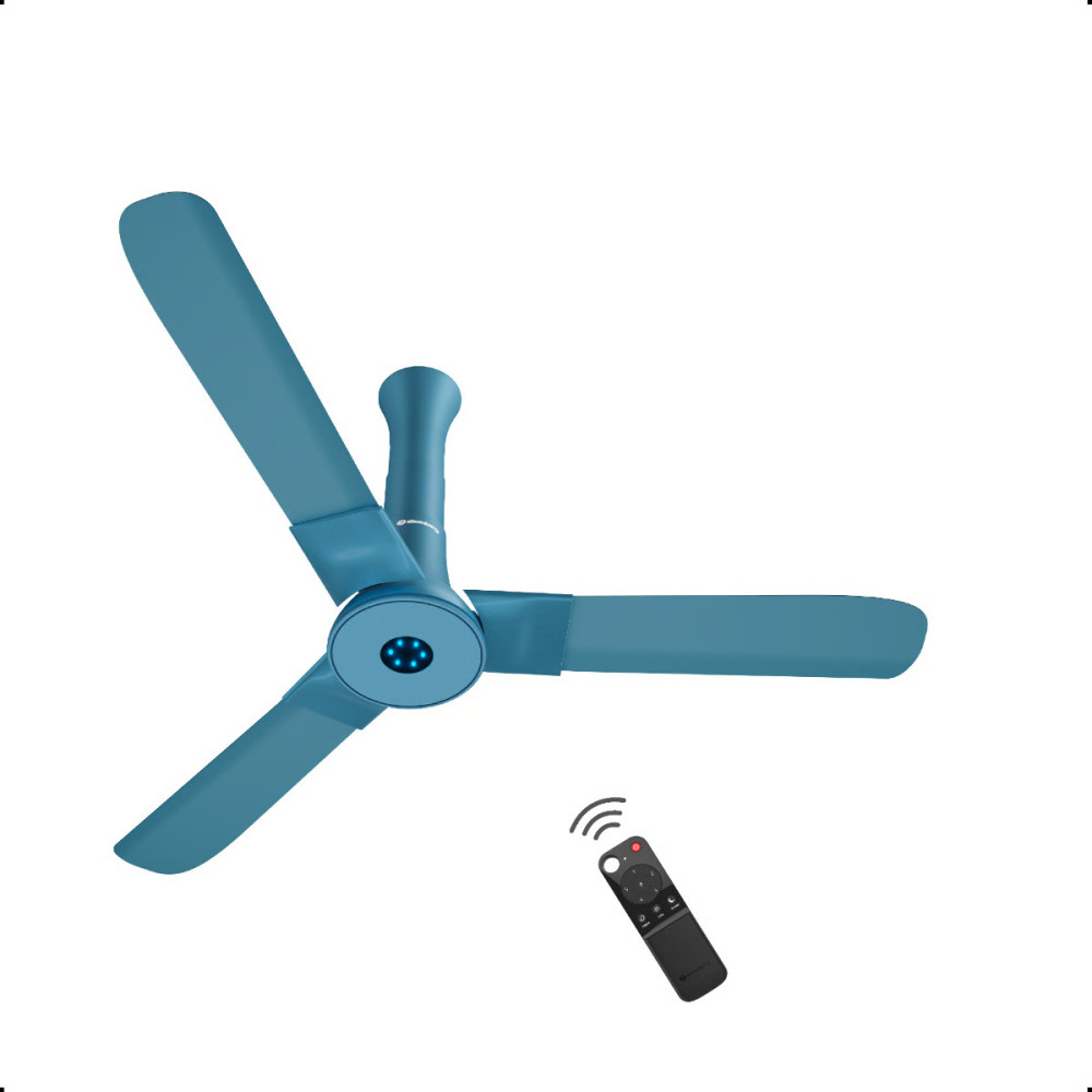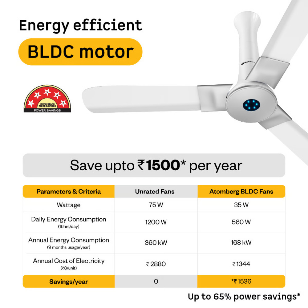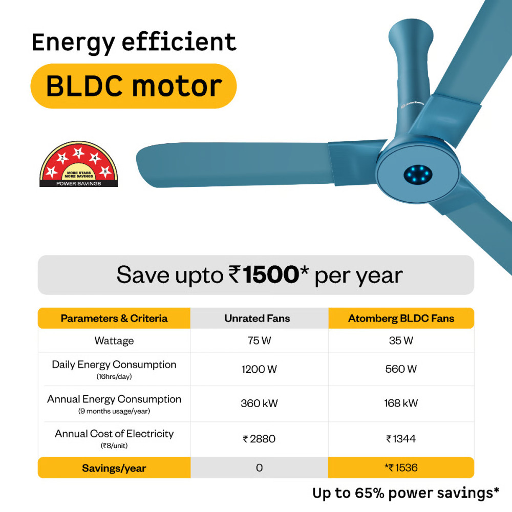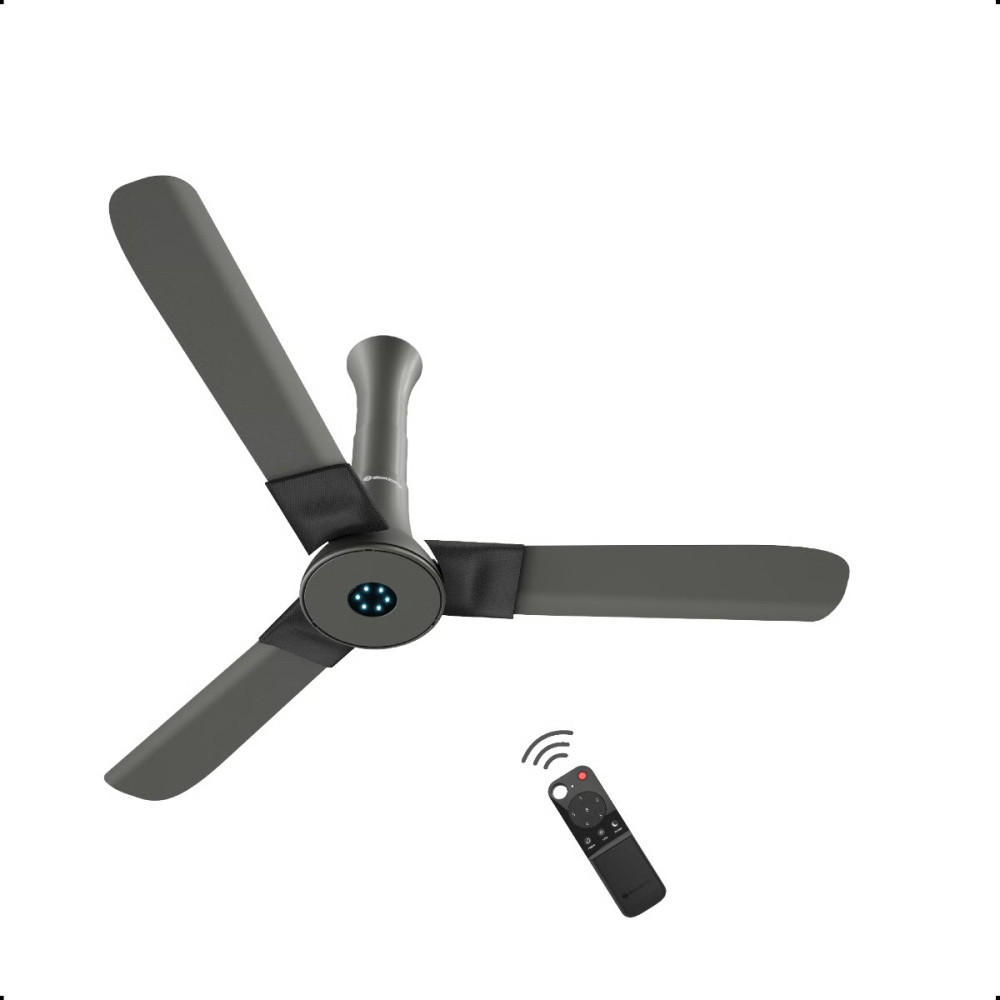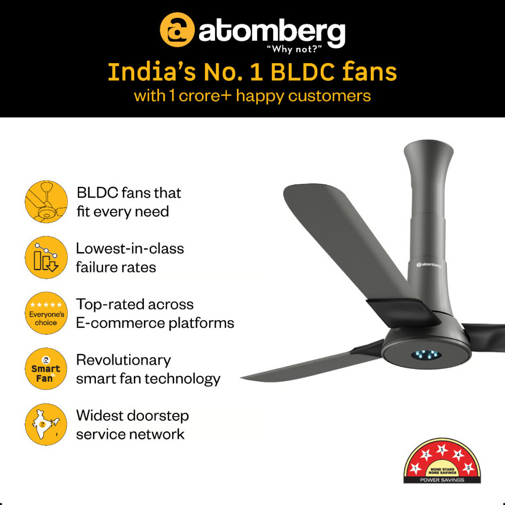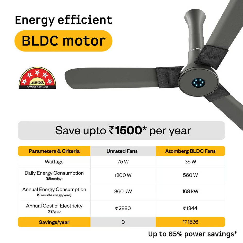 The Atomberg Studio+ ceiling fan features energy-efficient BLDC motor technology, providing a superior air delivery of 224 CMM at 360 RPM while consuming only 28W (at speed 5). The Studio+ ceiling fan saves up to 65% in electricity consumption, making it a 5-star rated choice for homes seeking efficiency. Adding to its convenience, the ceiling fan includes a Smart IR Remote for easy operation without the hassle of pairing. You can adjust the fan's speed or activate unique features such as boost mode, timer, or sleep mode at the touch of a button. Designed to enhance home decor, the Atomberg Studio+ ceiling fan has a sleek and elegant design with LED lights. Its metallic glossy blade finish adds a modern touch to any home. this ceiling fan ensures long-term reliability. The Atomberg Studio+ ceiling fan maintains consistent speed even during voltage fluctuations ranging from 165V to 285V, ensuring uninterrupted airflow. This ceiling fan runs three times longer on an inverter battery compared to conventional fans, providing comfort during power outages. Cleaning and maintenance are effortless with its dust resistant blades, making the Atomberg Studio+ ceiling fan a practical and stylish addition to any home.