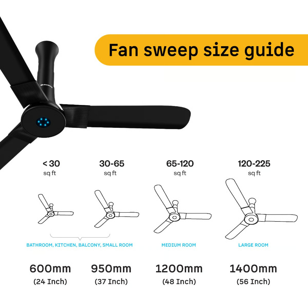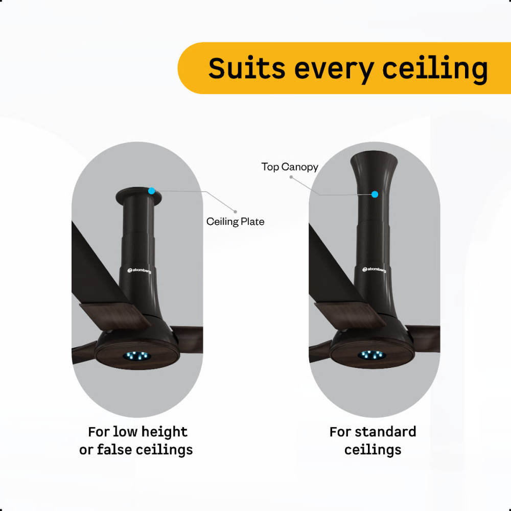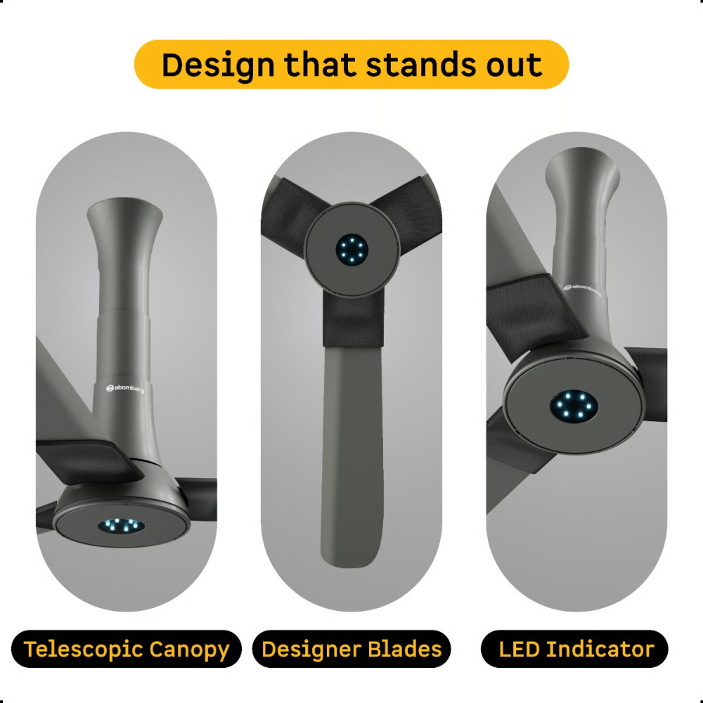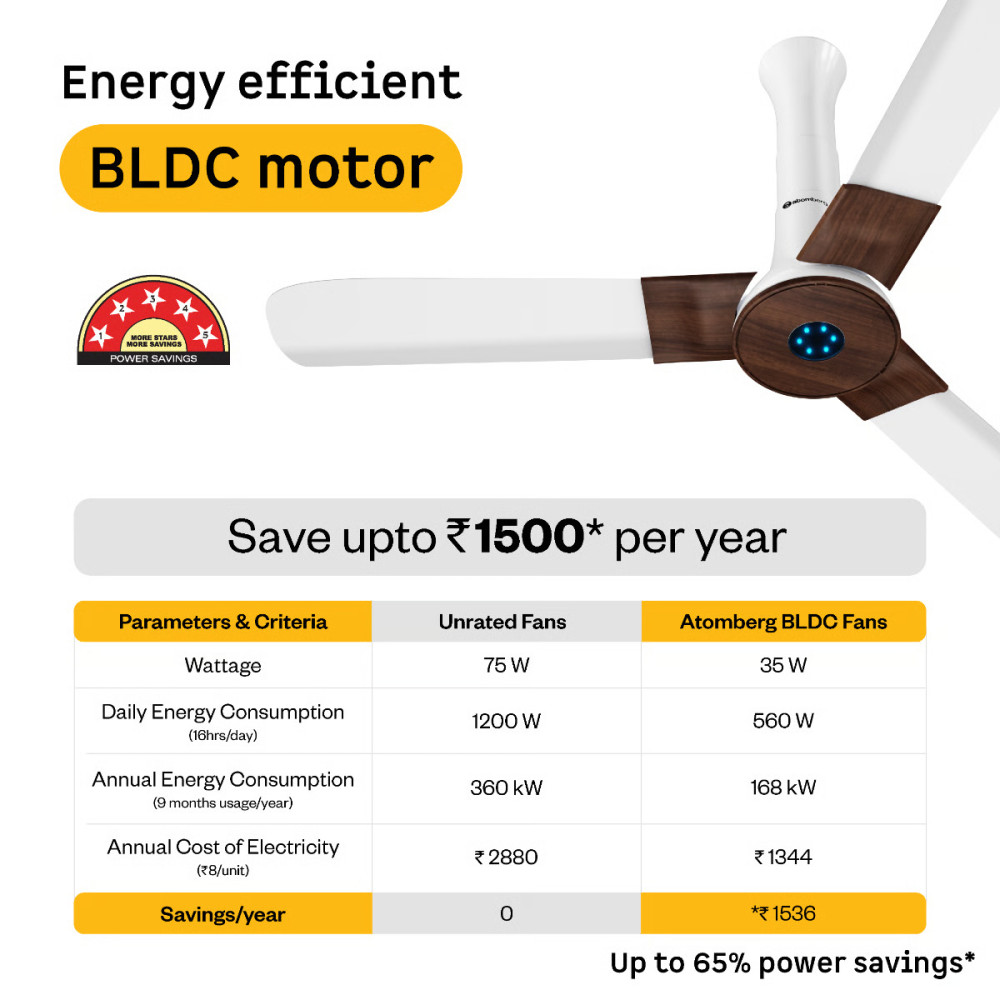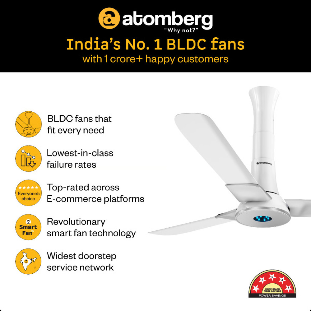 The Atomberg Studio+ ceiling fan features energy-efficient BLDC motor technology, providing a superior air delivery of 224 CMM at 360 RPM while consuming only 28W (at speed 5). The Studio+ ceiling fan saves up to 65% in electricity consumption, making it a 5-star rated choice for homes seeking efficiency. Adding to its convenience, the ceiling fan includes a Smart IR Remote for easy operation without the hassle of pairing. You can adjust the fan's speed or activate unique features such as boost mode, timer, or sleep mode at the touch of a button. Designed to enhance home decor, the Atomberg Studio+ ceiling fan has a sleek and elegant design with LED lights. Its metallic glossy blade finish adds a modern touch to any home. this ceiling fan ensures long-term reliability. The Atomberg Studio+ ceiling fan maintains consistent speed even during voltage fluctuations ranging from 165V to 285V, ensuring uninterrupted airflow. This ceiling fan runs three times longer on an inverter battery compared to conventional fans, providing comfort during power outages. Cleaning and maintenance are effortless with its dust resistant blades, making the Atomberg Studio+ ceiling fan a practical and stylish addition to any home.