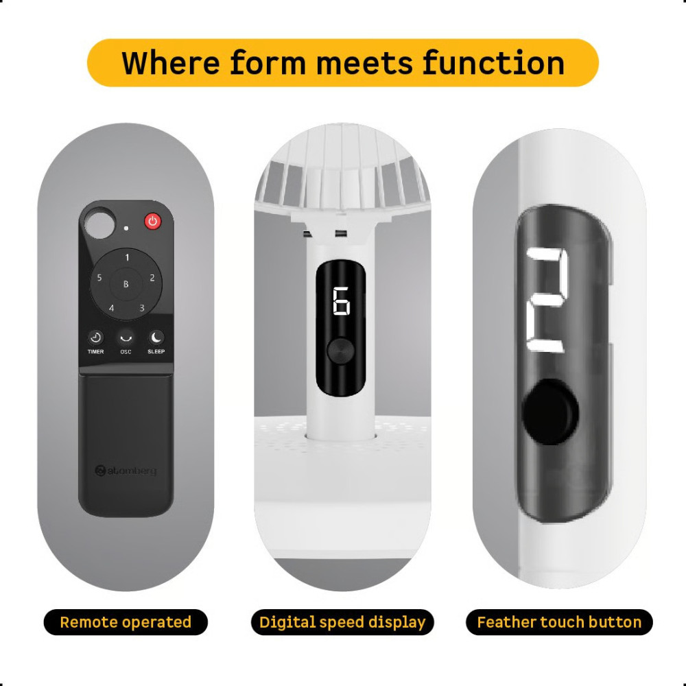 - REMOTE CONTROL CONVENIENCE: Atomberg Renesa table comes with an IR Remote for effortless control, allowing you to adjust speed, activate Boost mode, set timers, enable Sleep Mode with a single click or enable oscillation/swing mode. This remote is universal across Atomberg fans and does not need to be paired, allowing easy operation.