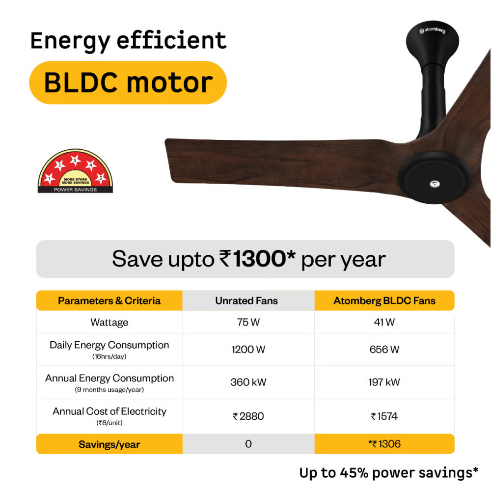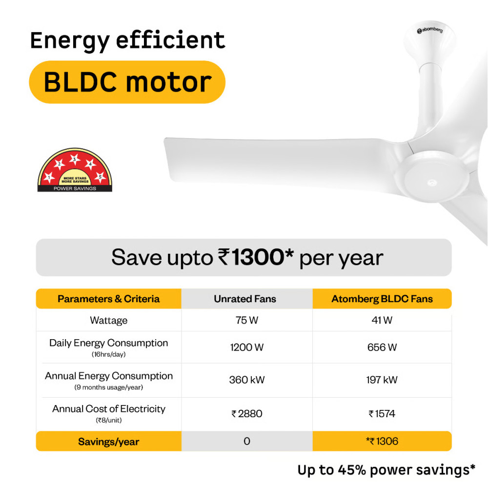 The Atomberg Aris Starlight ceiling fan features an integrated ABS design with aerodynamic blades for excellent air delivery and easy cleaning. It operates silently and has an adjustable canopy design for easy mounting. This ceiling fan comes with an underlight feature having 3 colour tones and varying intensities to upgrade the ambience of your room. With its energy-efficient BLDC technology, the Aris ceiling fan provides superior air delivery of 245 CMM at 350 RPM while consuming only 28W (at speed 5). This smart ceiling fan is IoT-enabled, allowing control via in-app voice commands through the Atomberg Home App. The ceiling fan can be operated through both Wi-Fi and Bluetooth. It is compatible with Alexa and Google Home devices. The ceiling fan includes a convenient IR Remote for easy adjustment of speed and activation of unique features like boost mode, timer, and sleep mode. With its unique and elegant design, the Aris Starlight ceiling fan adds a modern touch to your home decor. It provides consistent speed even during voltage fluctuations. It is easy to clean, and maintain and is dust-resistant. The ceiling fan comes with a 2+1 year warranty.